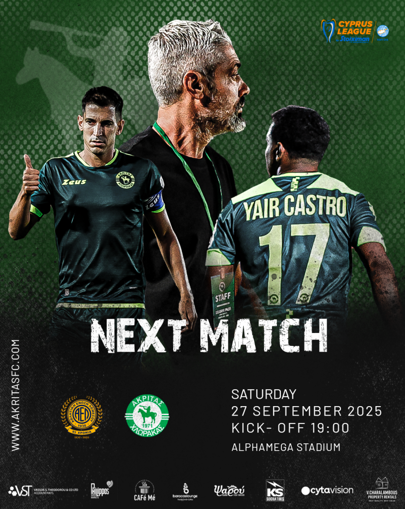 Επόμενος Αγώνας Το Σάββατο, 27 Σεπτεμβρίου 2027, στο Alphamega Stadium, η ομάδα μας θα αντιμετωπίσει την ΑΕΛ Λεμεσού με ώρα έναρξης 19:00. Περιμένουμε όλους τους φιλάθλους μας να στηρίξουν την ομάδα! Εισιτήρια διαθέσιμα στο γραφείο μας στην Χλώρακα και online: https://tickets.akritasfc.com NEXT MATCH On Saturday, September 27th, 2027, at Alphamega Stadium, our team will face