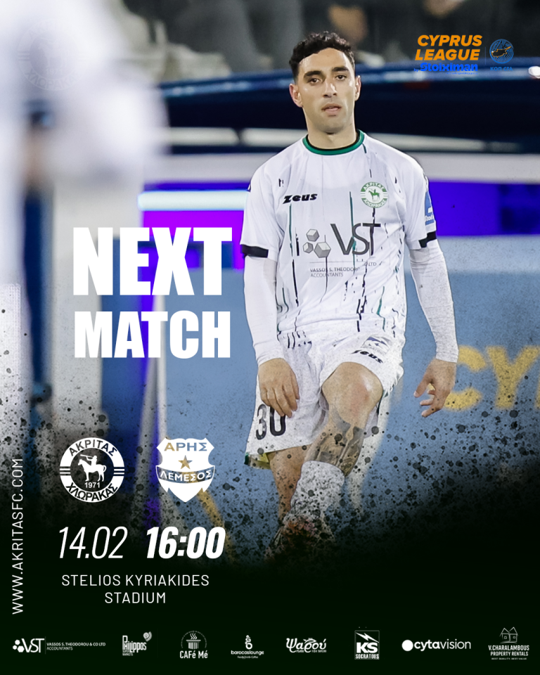 ΕΠΟΜΕΝΟΣ ΑΓΩΝΑΣ Το Σάββατο, 14 Φεβρουαρίου, στις 16:00, ο Ακρίτας Χλώρακας αντιμετωπίζει τον Άρη Λεμεσού σε εντός έδρας αγώνα στο Στάδιο «Στέλιος Κυριακίδης». Η στήριξή