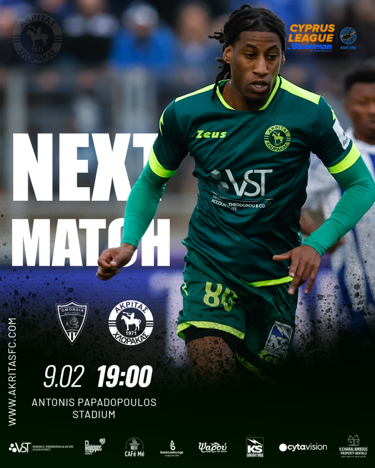 ΕΠΟΜΕΝΟΣ ΑΓΩΝΑΣ Τη Δευτέρα, 9 Φεβρουαρίου, στις 19:00, ο Ακρίτας Χλώρακας αγωνίζεται εκτός έδρας απέναντι στην Ομόνοια Αραδίππου, στο Στάδιο Αντώνης Παπαδόπουλος. Η παρουσία μας
