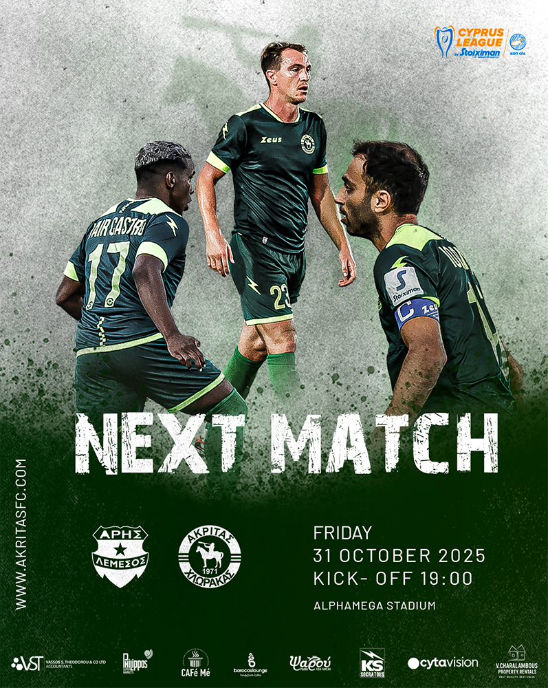 On Friday, October 31st, our team faces Aris Limassol in an away match at AlphaMega Stadium, starting at 19:00.
